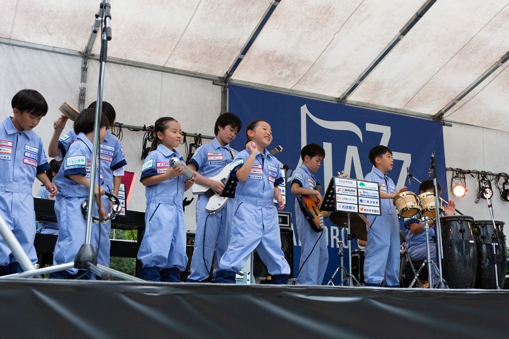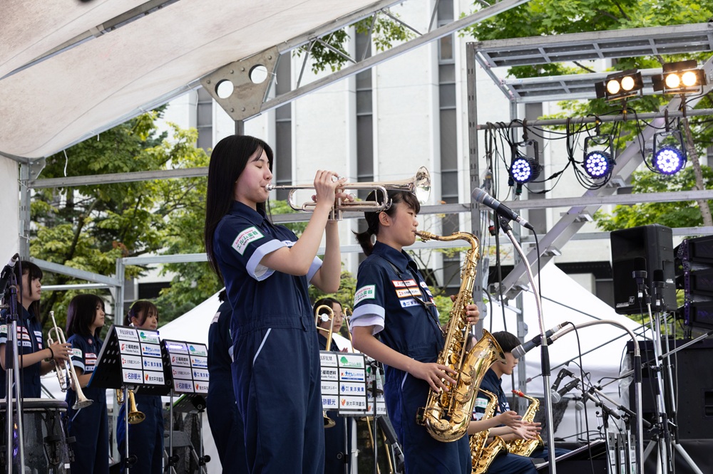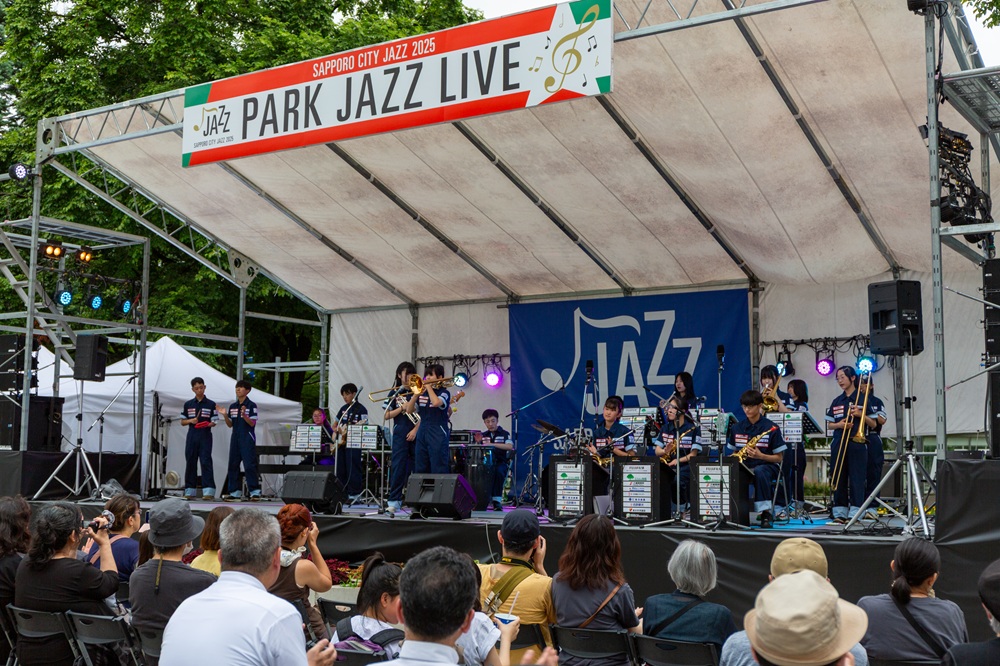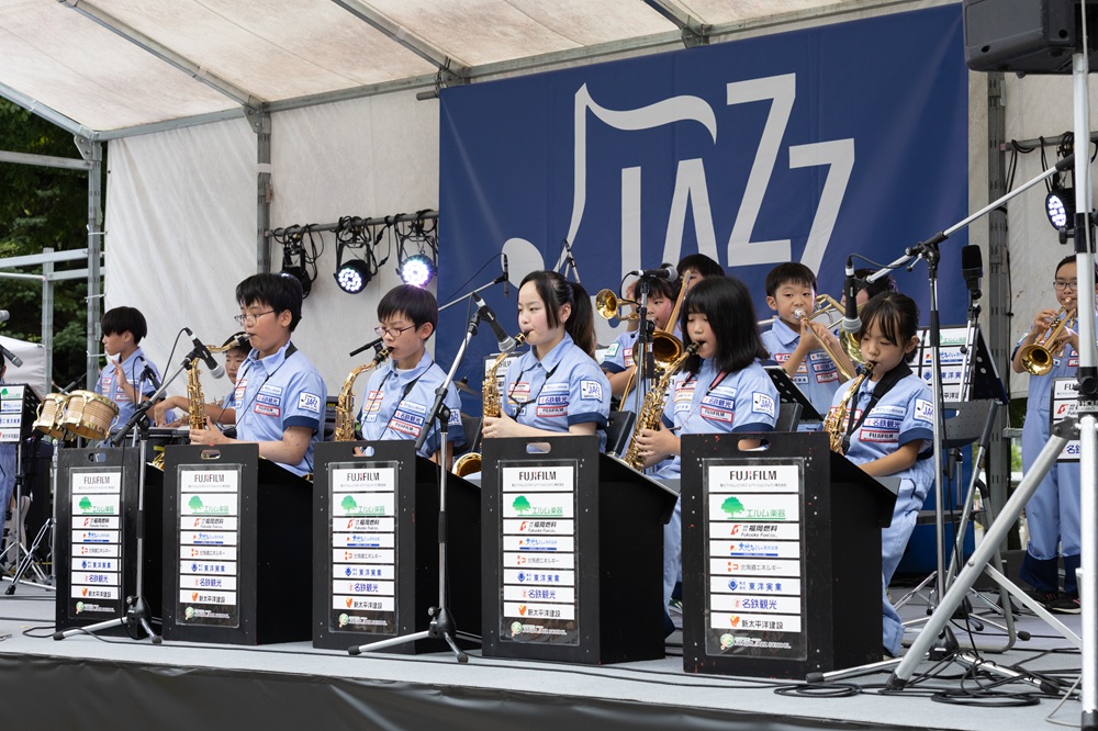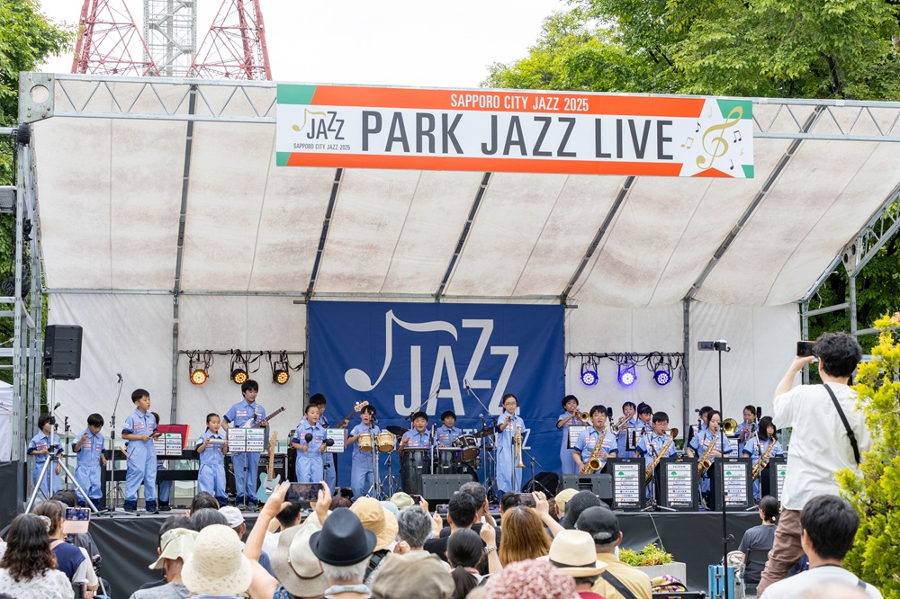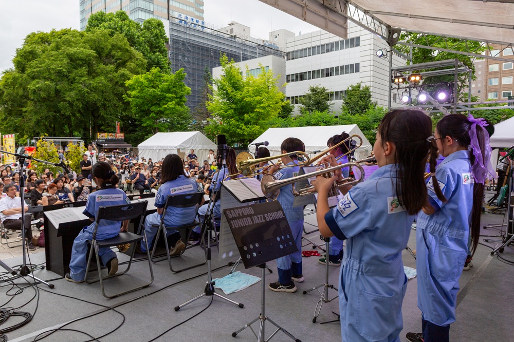 サッポロ・シティ・ジャズ2025 パークジャズライブのメイン会場である大通公園2丁目に両クラスが出演しました。天候に恵まれた大通公園に、たくさんのお客様が演奏を聴きに来てくださいました。小学生クラスは今期初めてのお客様の前での演奏であったため、緊張しながらも元気に4曲を演奏しました。中学生クラスは4月から練習を重ねてきた4曲を堂々と披露しました。どちらも会場から盛大な拍手をいただき、2日間のライブの幕開けとなりました。
