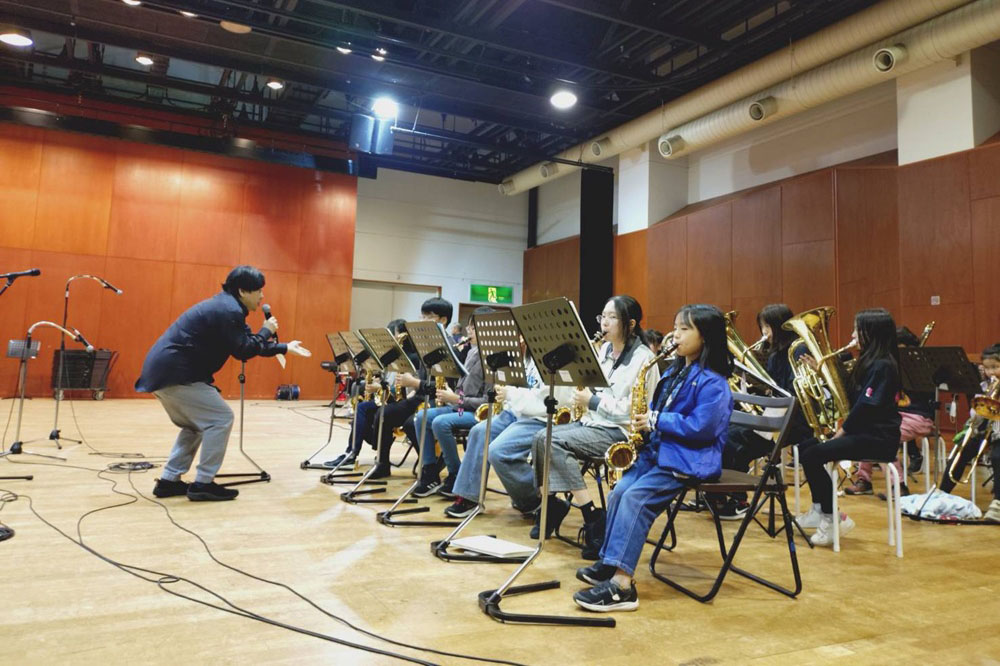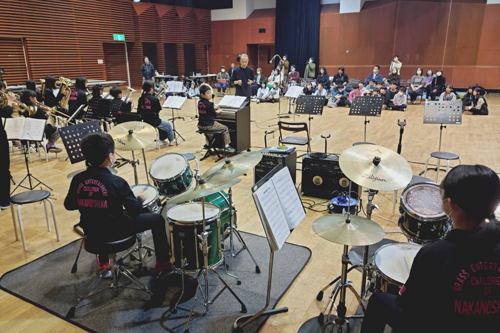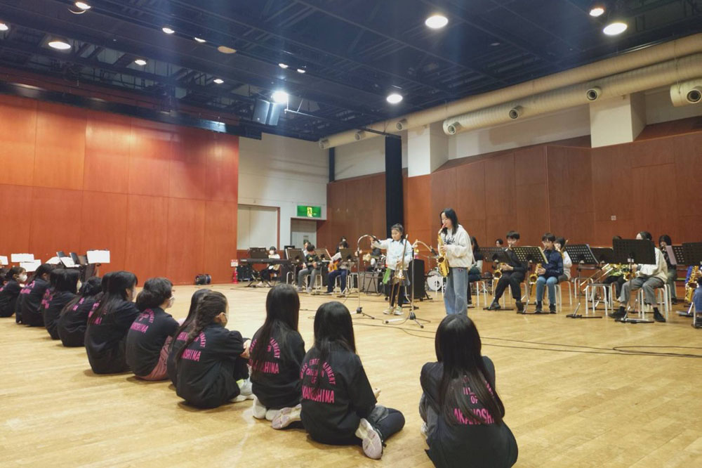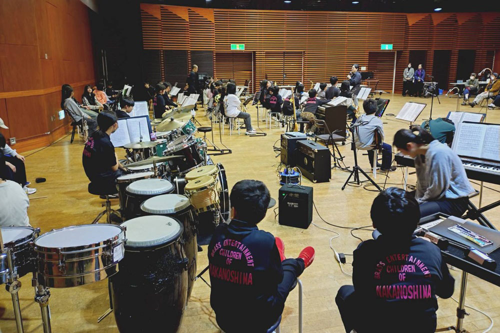 中の島BECON 合同ワークショップ 日程2025年10月25日(土) 場所芸術の森アートホール 大練習室 小学校でJazzを演奏している珍しいスクールバンド「中の島小学校ジャズバンド BECON」さんと合同練習を行いました。 まずはアイスブレイクでお互いの緊張を解きほぐし、演奏を披露し合いました。その後のワークショップでは、課題曲「MAS QUE NADA」を題材に講師の中嶋先生よりアドリブの方法を教わり、全員での大アドリブ大会となりました。