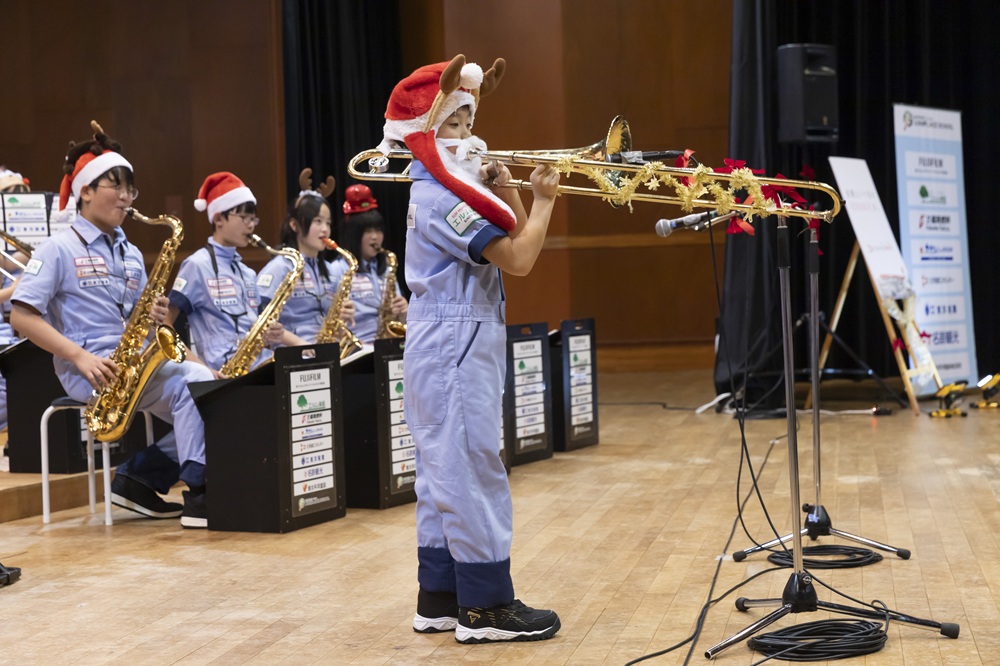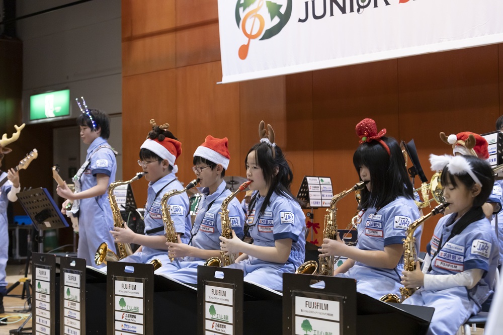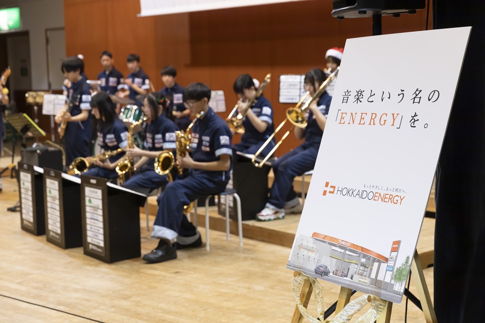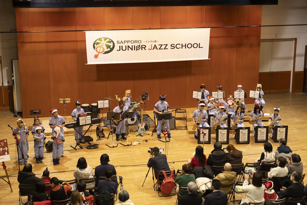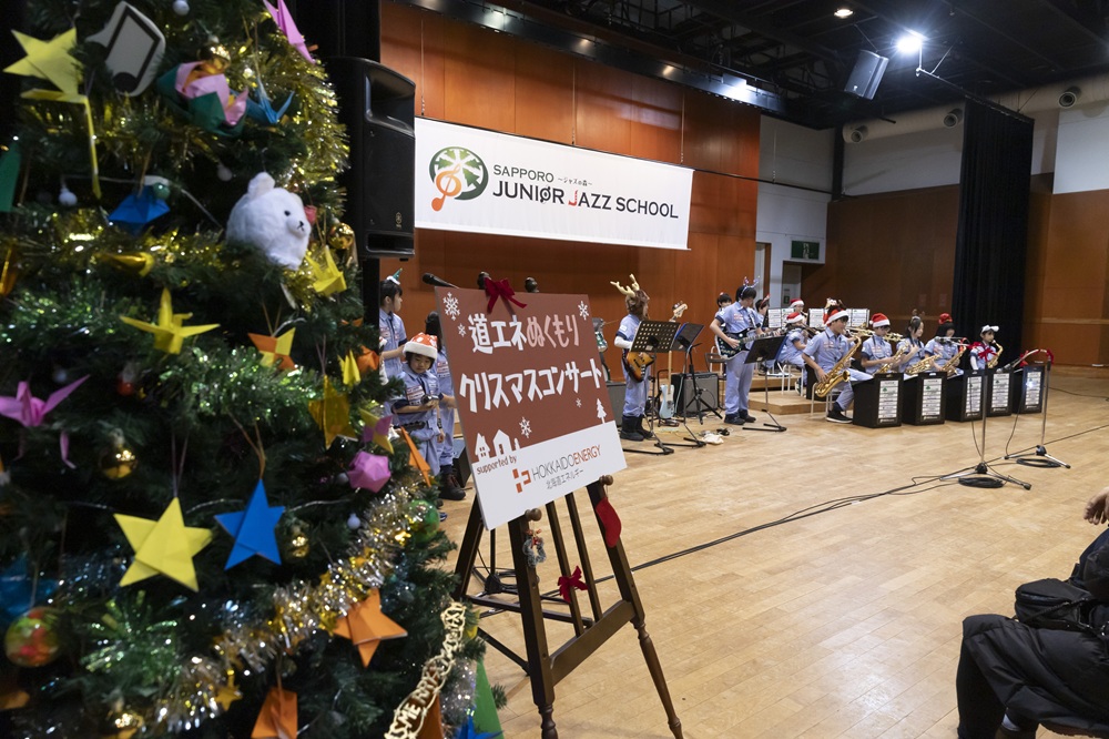 道エネぬくもりクリスマスコンサート2025 日程2025年12月13日(土) 場所芸術の森アートホール 大練習室 雪景色の芸術の森で「道エネぬくもりクリスマスコンサート」を開催しました。 ステージ脇では小学生クラスの手作りオーナメントを飾り付けたクリスマスツリーが会場を彩りました。 サンタ帽やトナカイの角を身につけたメンバーたちは、クリスマスの定番曲を中心に演奏を披露し、来場のお客様にノリの良いテンポのジャズで、少し早めのクリスマスをお届けしました。