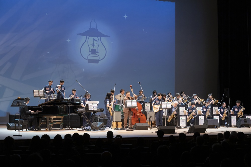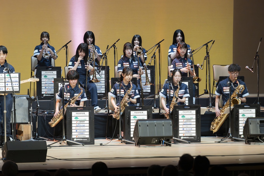 最後の曲では、今年のメインアクトの「向井滋春クインテット」の皆さんにゲストインしていただき、前日のワークショップでご指導いただいた向井滋春さん作曲の「ニムオロネイナ」を合奏し、会場を盛り上げました。