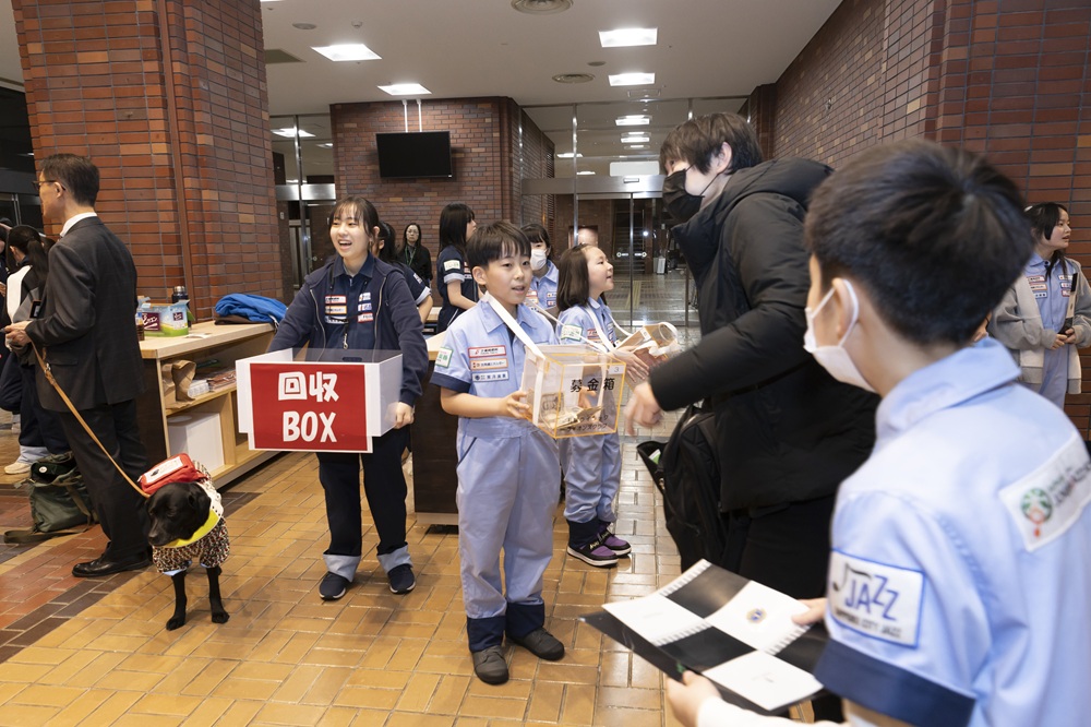 終演後には小中学生両クラスが、視覚障がい者支援のための募金活動をお手伝いしました。